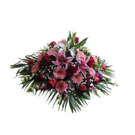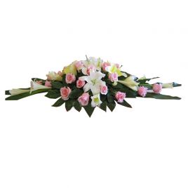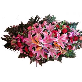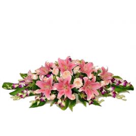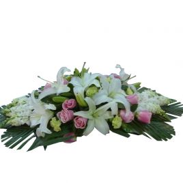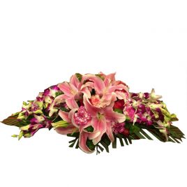 立体台花、桌花:粉色昌兰4枝,天堂鸟1枝,白百合5朵,粉康9朵,红玫瑰3枝,粉玫瑰2枝,绿色雏菊,黄自营 -