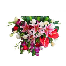 立体台花、桌花:白百合1朵,红掌3枝,天堂鸟2枝,金鱼草2枝,香槟色洋桔梗,粉玫瑰10枝,散尾叶,专自营 -