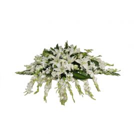 铁炮百合,白百合,戴安娜玫瑰。 [包装]:专用花泥底托,八角叶,巴西叶等搭配。自营