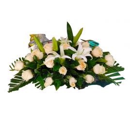 铁炮百合,白百合,戴安娜玫瑰。 [包装]:专用花泥底托,八角叶,巴西叶等搭配。自营 -