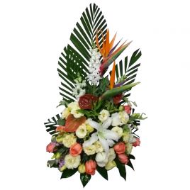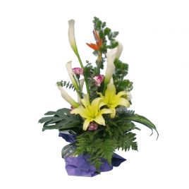 立体台花、桌花:马蹄莲5枝,天堂鸟1枝,黄百合2朵,花边康乃馨5朵,蓬莱松,龟背叶,高山羊齿叶,底托自营 -