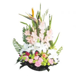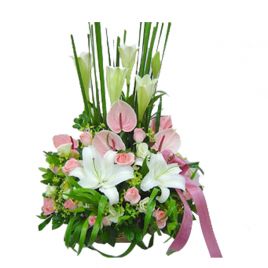 立体台花、桌花:白百合1朵,红掌3枝,天堂鸟2枝,金鱼草2枝,香槟色洋桔梗,粉玫瑰10枝,散尾叶,专自营