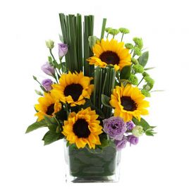 立体台花、桌花:向日葵2枝,蓝色绣球1枝,戴安娜玫瑰19枝,千代兰3枝,绿色桔梗,粉掌2枝,鸟巢叶,自营 -