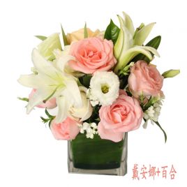 款式: 戴安娜+百合:戴安娜玫瑰,白色香水百合,洋桔梗,相思梅,栀子叶,玻璃花瓶插花。 香槟自营 -