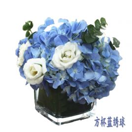 款式: 方杯蓝绣球:蓝色绣球,洋桔梗,尤加利叶,玻璃花瓶插花。 粉+香槟玫瑰:戴安娜玫瑰4枝自营 -