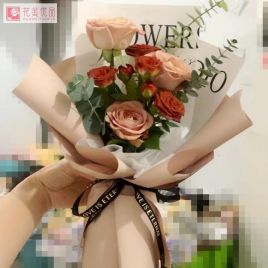 卡布奇诺玫瑰17枝,白玫瑰6枝,喷泉草洋甘菊搭配,驼色包装纸精美包装。自营 -