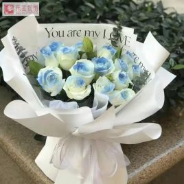 花材:白玫瑰15枝,蓝色满天星丰满。 包装:白色雪梨纸,白色字母纸内衬,天蓝色欧雅纸外包装,白色丝带自营 -