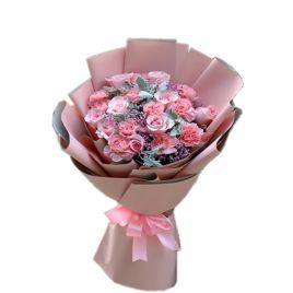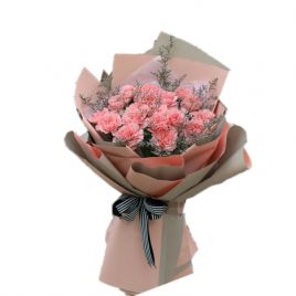 18枝粉色康乃馨,6枝粉玫瑰,2枝多头粉玫瑰,3枝刺琴,白色洋桔梗,红豆,尤加利搭配自营 -