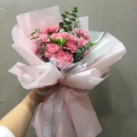 9枝粉色康乃馨,3枝粉玫瑰,1枝多头粉玫瑰,澳梅,黄英搭配自营 -