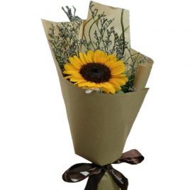 [材料]:1枝精选向日葵,情人草搭配。 [包装]:牛皮纸纸外包,缎带蝴蝶结装饰。 [场合]:看望自营