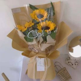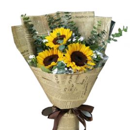 [材料]:3枝精选向日葵,尤加利,相思梅搭配。 [包装]:玻璃纸内衬,英文报纸外包,咖啡色字母缎带自营 -