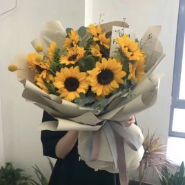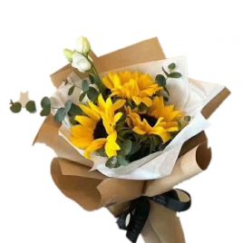 [材料]:3枝精选向日葵,尤加利,洋桔梗搭配。 [包装]:白色雪梨纸内衬,牛皮纸外包,黑色字母缎带自营 -