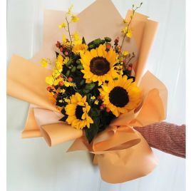 [材料]:3枝精选向日葵,尤加利,洋桔梗搭配。 [包装]:玻璃纸内衬,黑色卡纸外包,香槟色字母缎带自营 -