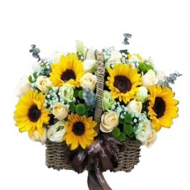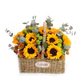 [材料]:向日葵10枝,绿色雏菊,橙色太阳菊,尤加利叶搭配。 [包装]:台式草编花篮精美制作。自营 -