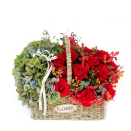 [材料]:绿色绣球,精选大玫瑰18枝,火龙珠,小叶尤加利,千代兰。 [包装]:台式草编花篮精美制自营 -