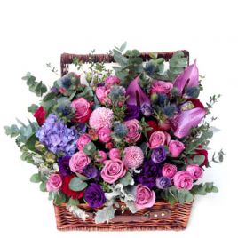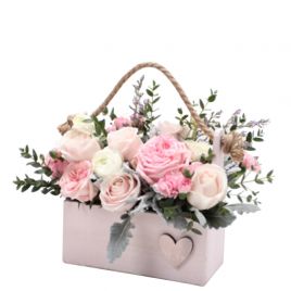 [材料]:紫玫瑰,雪山白玫瑰,康乃馨,小叶尤加利,刺琴,白色纽扣菊。 [包装]:木盒式手提花篮精自营 -