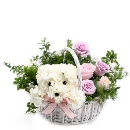 [材料]:白色康乃馨制作小狗模型,紫玫瑰,香槟玫瑰,粉雪山玫瑰装饰,天门冬和手球叶搭配。 [包装自营 -
