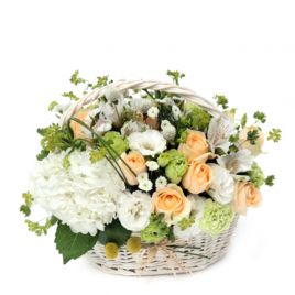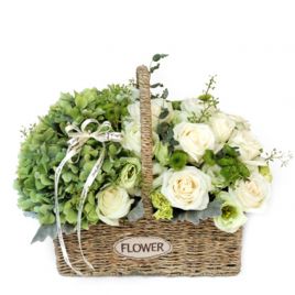 [材料]:绿色绣球,雪山白玫瑰,配花洋桔梗搭配,小菊,绿色康乃馨,银叶菊。 [包装]:草编花篮精自营 -