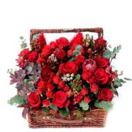 [材料]:优选红玫瑰,红色康乃馨,小叶尤加利,刺琴,火龙珠搭配。 [包装]:木盒式手提花篮精美制自营 -