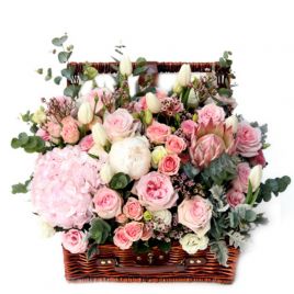 [材料]:粉色绣球,荔枝玫瑰,戴安娜玫瑰,粉色多头玫瑰丰满,白色郁金香,洋桔梗,尤加利,银叶菊,澳自营 -