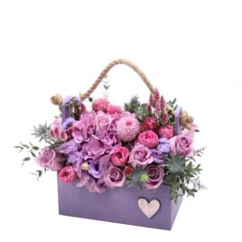 [材料]:紫色玫瑰,紫色绣球,紫色多头玫瑰,小叶尤加利,洋桔梗,刺琴,凤尾搭配。 [包装]:木盒自营 -