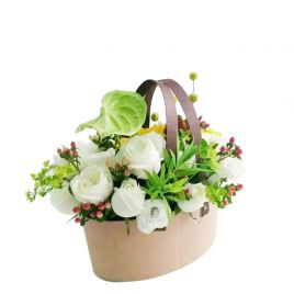 [材料]:白色洋桔梗,雪山玫瑰,绿掌,火龙珠,黄金球,叶上金搭配。 [包装]:牛皮纸盒式手提花篮自营 -