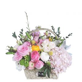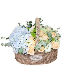 [材料]:天蓝色绣球,香槟玫瑰,洋桔梗搭配,绿色雏菊,叶上花,尤加利点缀。 [包装]:草编花篮精自营 -