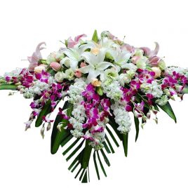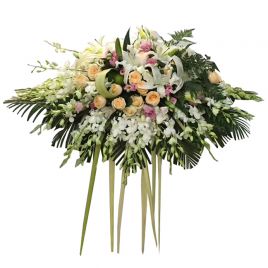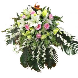 [材料]:白、粉色香水百合多头5枝,粉玫瑰15枝,洋兰6枝。 [包装]:讲台专用花泥底座,散尾叶自营 -