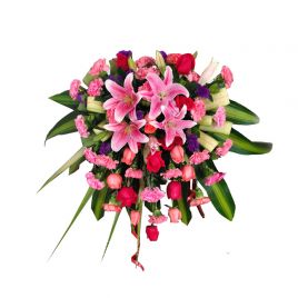 [材料]:戴安娜玫瑰、粉百合,洋兰。 [包装]:讲台专用花泥底座,散尾叶,海桐叶,石竹梅搭配。自营 -