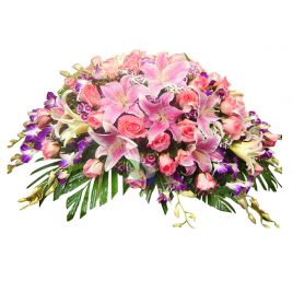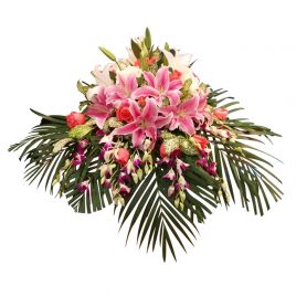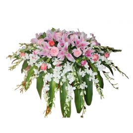 [材料]:粉玫瑰、粉百合、白洋兰。 [包装]:讲台专用花泥底座,巴西叶,栀子叶搭配。自营 -