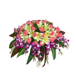 [材料]:洋兰10枝,黄百合12朵,粉玫瑰22枝。 [包装]:讲台专用花泥底座,巴西叶,海桐叶丰满自营 -