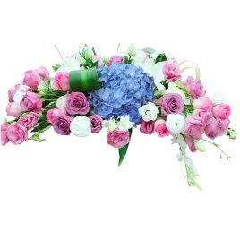 [材料]:蓝色绣球,紫玫瑰,深粉洋桔梗,苏醒玫瑰。 [包装]:讲台专用花泥底座,巴西叶,栀子叶等自营 -