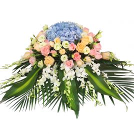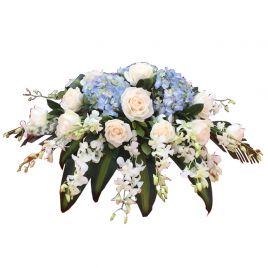 [材料]:蓝色绣球,白玫瑰,白色洋兰。 [包装]:讲台专用花泥底座,巴西叶,栀子叶等搭配。自营 -