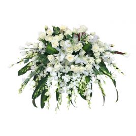[材料]:白百合,白玫瑰,白色洋桔梗,白色洋兰。 [包装]:讲台专用花泥底座,巴西叶,栀子叶等搭自营 -