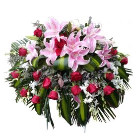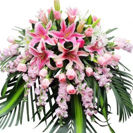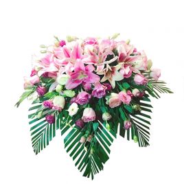 [材料]:百合8朵,粉康乃馨24枝,红、粉玫瑰13枝。 [包装]:讲台专用花泥底座,黄剑叶,勿忘自营 -