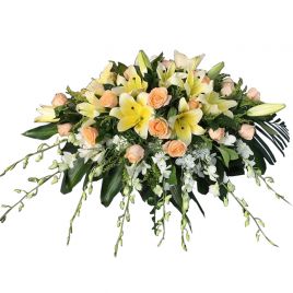 [材料]:粉百合,白百合,戴安娜玫瑰,白玫瑰,洋兰10枝。 [包装]:讲台专用花泥底座,散尾叶,自营 -