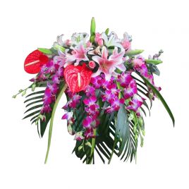 [材料]:粉玫瑰、白色百合、洋兰,大红掌2枝,吉祥鸟2枝。 [包装]:讲台专用花泥底座,散尾叶,自营 -