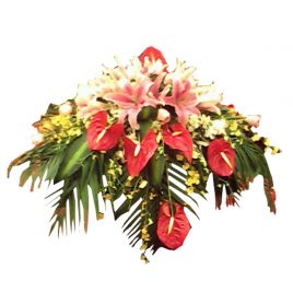 [材料]:大红掌7片、粉色百合、跳舞兰,粉玫瑰。 [包装]:讲台专用花泥底座,散尾叶,巴西叶搭配自营 -