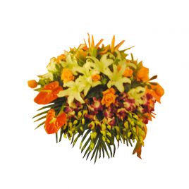 [材料]:橙色扶郎、粉色百合、洋兰,粉色勿忘我。 [包装]:讲台专用花泥底座,散尾叶,栀子叶搭配自营 -