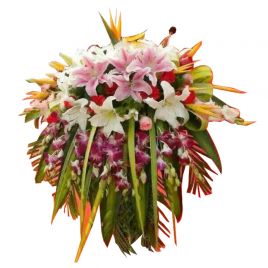 [材料]:红玫瑰、粉玫瑰、粉百合、白百合、洋兰,吉祥鸟2枝、小鸟10枝。 [包装]:讲台专用花泥自营 -
