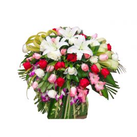 [材料]:红玫瑰、粉百合,白洋兰。 [包装]:讲台专用花泥底座,散尾叶,巴西叶,情人草搭配。自营 -