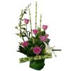 立体台花、桌花:紫玫瑰7枝,富贵竹,白兰,黄英,巴西叶底托花泥插花。