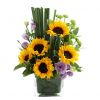 方杯前台花、桌花:向日葵5枝,紫色洋桔梗,绿色雏菊,水蜡叶,玻璃花瓶插花。