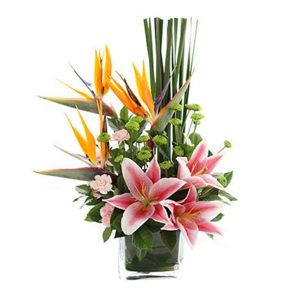 方杯前台花、桌花:粉色百合3朵,天堂鸟3枝,绿色雏菊,粉色多头康,水蜡叶,玻璃花瓶插花。