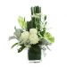 方杯前台花、桌花:粉白玫瑰3枝,绿掌2枝,银叶菊,蕾丝,栀子叶,水蜡叶搭配,玻璃花瓶插花。