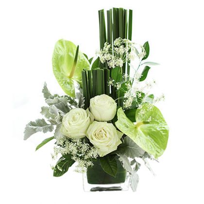 方杯前台花、桌花:粉白玫瑰3枝,绿掌2枝,银叶菊,蕾丝,栀子叶,水蜡叶搭配,玻璃花瓶插花。
