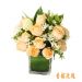 香槟玫瑰:香槟玫瑰,栀子叶,相思梅,玻璃花瓶插花。