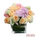 香槟玫瑰绣球:香槟玫瑰,戴安娜玫瑰,桔梗,粉色绣球,玻璃花瓶插花。
