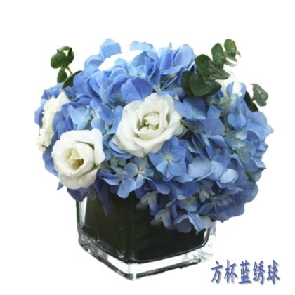 款式: 方杯蓝绣球:蓝色绣球,洋桔梗,尤加利叶,玻璃花瓶插花。 粉+香槟玫瑰:戴安娜玫瑰4枝