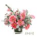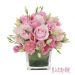 雪山玫瑰+桔梗:粉色雪山玫瑰,粉色洋桔梗,粉色康乃馨,玻璃花瓶插花。